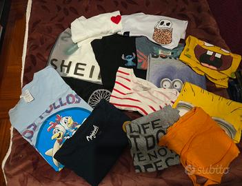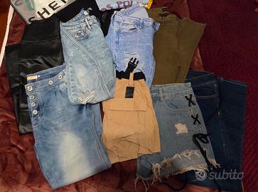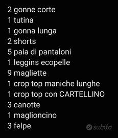 VENDO IN BLOCCO 30 PEZZI DI VESTIARIO RAGAZZA TAGLIA XS/S. IL BLOCCO COMPRENDE: 2 gonne corte 1 tutina 1 gonna lunga 2 shorts 5 paia di pantaloni 1 leggins ecopelle 9 magliette 1 crop top maniche lunghe 1 crop top con CARTELLINO 3 canotte 1 maglioncino 3 felpe TUTTO IN OTTIMO STATO. VENDO A CHI RITIRA PRIMA ZONA EUR.