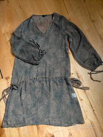 Completo Extyn pantaloncino tg. 44M in rasatello pesante color bronzo e maglietta abbinata T.U. con particolare scollo aperto sul petto € 40 Vestito Liu.Jo tg. 44 in viscosa elasticizzato tinta marrone bruciato con vertiginoso scollo sulla schiena € 70 Copricostume maculato Woman tg M € 15