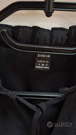 Vestido negro de manga larga con un diseño de volantes. - Cuello con volantes y lazada. - Cintura elástica. - Mangas largas abullonadas. - Falda con varios volantes. Nunca usado