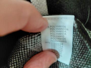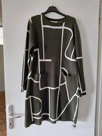 Vestito di lana da donna colore verde scuro con geometrie bianche taglia M/L. Corredato di gilet bianco lungo con tasche sempre taglia M/L. Usato in una occasione, riposto con cura.