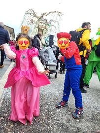 Indossati un solo giorno ,le taglie sono: super Mario bimbo 5-6 anni ,principessa Peach bimba 3-4 anni, Luigi adulto taglia L, principessa Daisy adulto taglia S