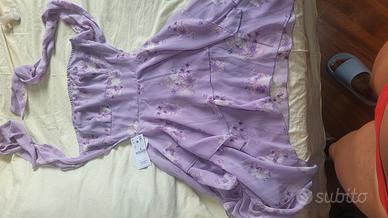 vestito nuovo a fiori color lilla. si lega dietro il collo, leggero e frizzante.