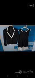 Completo composto da vestitino bianco e nero con fascia elastica in vita e parte inferiore a trama. Taglia unica. cerniera posteriore. Misure abito lunghezza 90 cm, spalle 35 cm, giro seno 41cm.