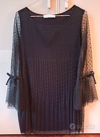 Vestitino donna elegante nero in doppio strato di cui uno in pizzo con maniche lunghe trasparenti in pizzo a pois con fiocchetto. Ottima vestibilità. Prodotto da Rinascimento Italia. Praticamente nuovo. Taglia XS