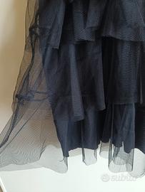 Vestito nero corto, con balze, tulle e fiocchetto.