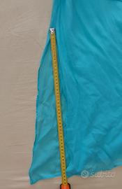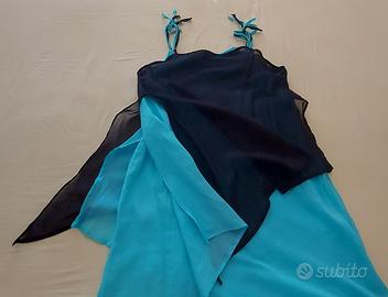 ottima vestibilità, taglia unica, adattabile dalla 44 alla 48. La base del vestito è turchese con sormontati 2 veli asimmetrici della stessa stoffa: uno dello stesso colore del vestito e l'altro nero. (i particolari nelle foto e le misure in cm.)