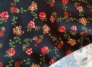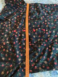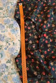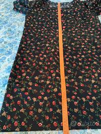 Vestitino vintege corto nero a fiori rossi con bellissima scollatura quadrata e particolare. Mancano le etichette sia con la taglia che con il materiale. come taglia, veste bene un 46/48, verificate bene le misure riportate in foto. Il tessuto è un sintetico tipo raso, appena elasticizzato, ma pochissimo, quasi per niente. Unico piccolo difetto, un filo tirato visibile nell’ultima foto, per il resto è in ottime condizioni.