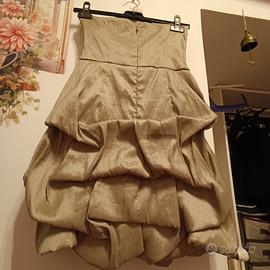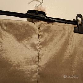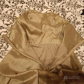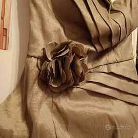 vestito a décolleté color bronzo/ oro, drappeggiato in taffettà. con fiore dello stesso tessuto. taglia S cn zip dalla parte posteriore. Ottimo stato, usato due volte.