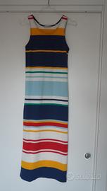 Abito aderente in tessuto elasticizzato a costine, senza maniche e con vestibilità slim. La fantasia a righe orizzontali combina diverse tonalità (blu, giallo senape, verde, rosso, bianco e celeste), rendendolo vivace e originale. Perfetto per la stagione estiva e per look casual ma d’effetto. Mai indossato. Nuovo.