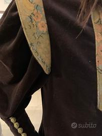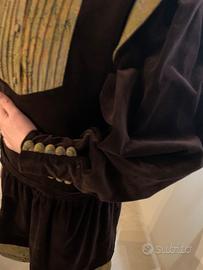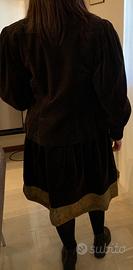 Completo vestito manica lunga e giacca con manica sbuffo velluto marrone scuro con inserti damascati anni 80 indossato 2 volte