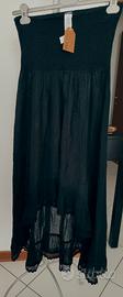 Abito doppia lunghezza (più corto sul davanti). La banda elastica permette di indossarlo indifferentemente come gonna o come abito. Ideale anche come copricostume/beachwear. Tessuto leggerissimo 100% cotone. Taglia unica.