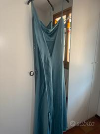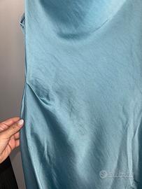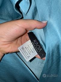 Abito originale Kaoa lungo azzurro in tessuto fluido con lucentezza satinata, scollo drappeggiato sul davanti e profondo scollo a V aperto sul retro con morbido dettaglio di pieghe. Spacco laterale. Nuovo senza etichette, mai utilizzato. Taglia L (veste bene anche una M rimanendo più morbido sul corpo).