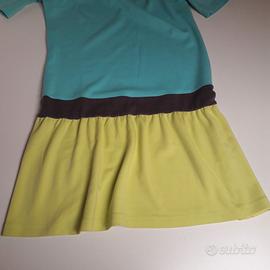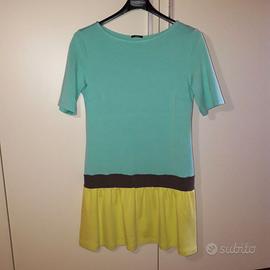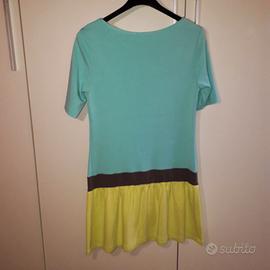 Mini abito estivo marca Tezenis, con maniche corte, collo a girocollo, balza in fondo. Parte superiore colore azzurro, riga centrale marrone e balza color verde acido/giallo. Tessuto in jersey medio-pesante, elasticizzato.
