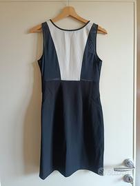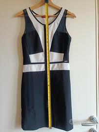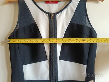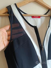 Vestito corto e aderente, di colore bianco e nero che presenta una lunga cerniera frontale.