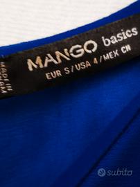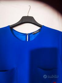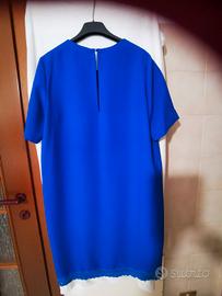 vestito elegante colore bluette a tubino due tasche con bordo in pizzo scollatura a girocollo mezza manica tessuto in crepes di seta marca Mango