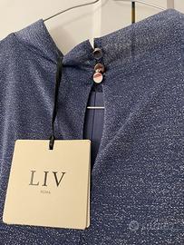 Vestito bluette con lurex taglia unica molto luminoso. Cade molto bene e resta “leggero” lunghezza media, adatto ad aperitivi, serate, matrimoni etc. Marca LIV nuovo con etichetta.