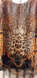 Vestito a Caftano leggero, trasparente, motivi esotici in stile Animalier, con sottovestito nero elasticizzato all'interno, lunghezza al ginocchio. Ideale per l'estate. Made in Italy. Taglia Unica. Multicolore a motivi esotici. Tessuto Caftano: 100% Poliestere. Tessuto vestitino interno: 95% Viscosa, 5% Elastan. Nuovo, appena acquistato, mai indossato se non per prova.