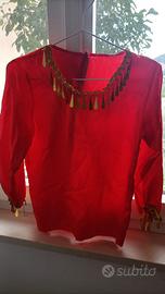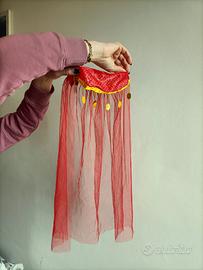 Descrizione: vestito da Odalisca composto di 4 pezzi: pantalone, maglia con paillettes, gonna da mettere sopra il pantalone con paillettes e velo per i capelli. Taglia 34 usato una sola volta.