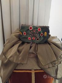 Fantasy fatto a mano ad ispirazione artistica, tunica con applicazioni di vari colori, tessuti e passamaneria, mantello in voile e cappello.
