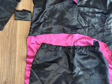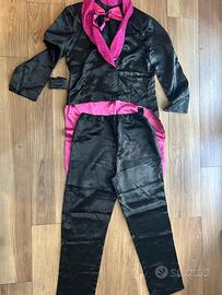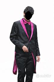 Vendo costume di Carnevale da uomo composto da due pezzi, una giacca stile frac e un paio di pantaloni, realizzati in raso prevalentementenerocon dettaglirosafucsia.