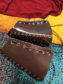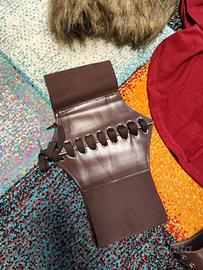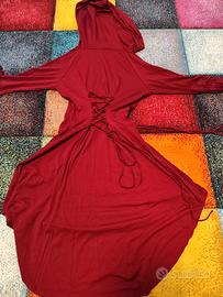 - Vestito stile medievale (lacci per regolazione in vita davanti e dietro, gonna sfasata lunga dietro e corta davanti, foro per pollice per coprire le mani, largo cappuccio)