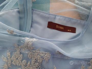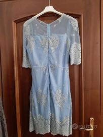 vestito color celeste con pizzo e ricami argentati di foglie, fiori e stelline.