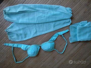 Vestito in pura seta acquistata in India color celeste come i 2 manicotti, il reggiseno, la gonna doppia ed il top. (anche se sulla foto sembra verde ma il colore della seta è celeste e oro). La seta è ricamata con fili e pajettes color oro. su tutto il perimetro.