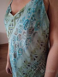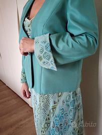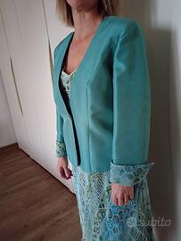 Vestito cerimonia donna taglia 48 colore turchese in seta, il vestito è stato realizzato da Atelier Sposa per una cerimonia messo una sola volta. Si compone di vestito in seta, stola copri spalle in seta e giacca abbinata sempre in seta. Nel costo lascio in omaggio decorazione con spilla abbinata Vendo perchè taglia troppo grande per me come si vede in foto