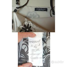 Abito elegante da cerimonia in raso, marca Motivi, lunghezza al ginocchio, colore avorio con fiori neri, sottogonna con tulle nero, nastro da annodare in vita color marrone, zip laterale, spalline regolabili. Made in Italy.