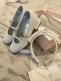 Abito da comunione Monnalisa con scarpe numero 35 e cerchietto abbinato tutto della stessa marca di moda Monnalisa taglia vestito 11 anni perfetto per bimba di 9/10 anni