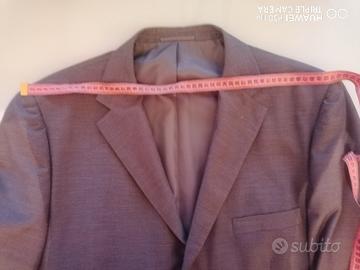 Completo uomo giacca 3 bottoni e pantalone. Giacca con 3 tasche interne 2 esterne, pantalone tasche laterali e 2 tasche con bottoni retro. Pantalone classico con riga. Tg. 56. Misure in foto. Colore grigio. Tessuto misto viscosa lana cotone.