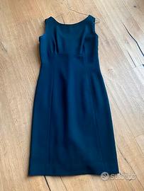 Completo, vestito con zip laterale e giacca corta in vita, manifattura sartoriale, colore blu scuro con rifiniture blu in groghen, taglia 42