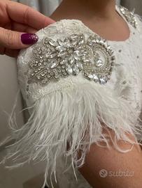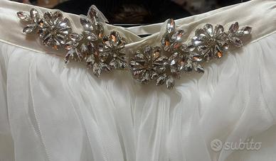 Abito sartoriale, veste dai 10 anni e adattabile in lunghezza perché ha lo strascico. Modello 2 in 1, il gonnellone è smontabile in tulle, la tutina è in pizzo francese. Tutto fatto a mano con applicazioni di Swarovski. Ovviamente pari al nuovo. Pagato 900€ No perditempo vendo a 400€ posso regalare anche il saio che è stato comprato non prestato dalla chiesa.