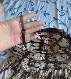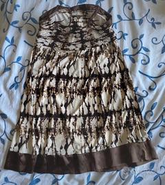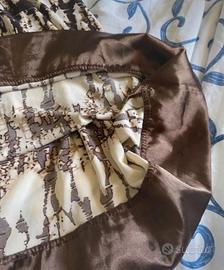 Fantasia particolare nei toni del marrone e crema, con cintura sotto al seno decorata da due bottoncini e bordo in raso sul fondo.