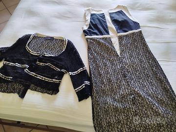 Vestito in cotone altezza ginocchio, smanicato con giacchino coordinato. Colore nero e bianco. Marca Sandro Ferrone, linea sweet size, TAGLIA S (TAGLIE MORBIDE) corrispondente ad una 46. Indossato solo una volta, in perfette condizioni.