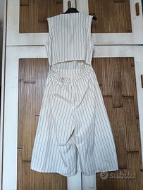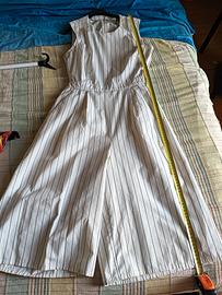 vestito con gonna pantalone bianco a righe nere. la gonna è foderata all'interno.Elasticizzato in vita. Veste taglia 46 italiana. Misure lunghezza totale 110 cm, lunghezza gonna pantalone 70 cm, larghezza ascella 42, larghezza vita alta 34 cm.