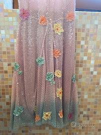 Vendo vestito rosa con paillettes cucite singolarmente con fiori applicati e sfumatura verde acqua all'estremità. Taglia M/L, corrisponde alla 44. Marca JORANDO. Compresa stola abbinata di colore rosa.