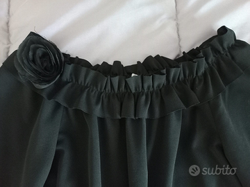 Vestitino nero, linea svasata, con particolare scollo a barca arricciato ed elasticizzato, finemente decorato con un'applicazione a forma di fiore ton sur ton.