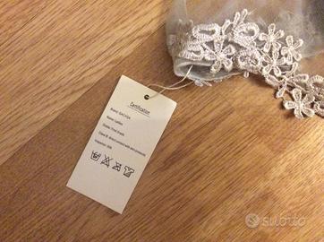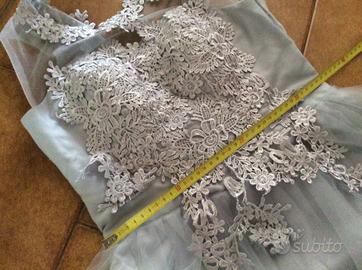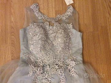 Bellissimo vestito corto in tulle e con decorazioni di pizzo macramè, nuovo con cartellino.