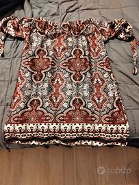 Vendo vestito corto oppure maglietta lunga stile boho/etnico. Collo elasticizzato che può stare morbido sul collo oppure teso sulle spalle. Mezze maniche con lacci per fiocco. Marca Zebra a pua.