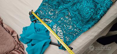 bellissimo vestito cucito a mano,indossato pochissime volte solo per cerimonie importanti,la signora che lo indossa ha una 44/46,molto comodo e bello,sopratutto di altissima qualità