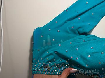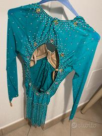vestito da ballo caraibico color turchese, si tratta di un body realizzato a mano su misura per una ragazza alta 1,50 m. Il tessuto in Lycra elasticizzata garantisce una vestibilità comoda e aderente, perfetta per balli come salsa, bachata e altri stili caraibici. Le maniche semitrasparenti aggiungono un tocco di eleganza.