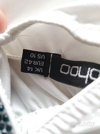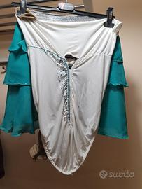 Vendo vestito/abito da ballo di colore blu acquamarina e bianco, interamente fatto a mano dalla sarta con applicazioni in strass blu acquamarina applicati uno ad uno a mano per spettacoli o competizioni caraibici/salsa/latino american. Indossato un paio di volte per esibizione.