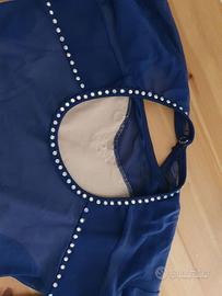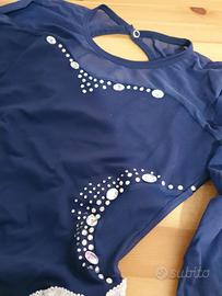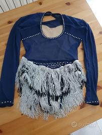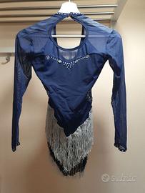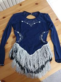 Vendo vestito/abito da ballo di colore blu interamente fatto a mano dalla sarta con frange argento e nere e applicazioni in strass bianchi brillanti effetto multicolor applicati uno ad uno a mano per spettacoli o competizioni caraibici/salsa/latino americano MAI indossato in esibizione (impossibilitata al saggio) quindi assolutamente NUOVO, indossato solo per prova con la sarta.