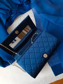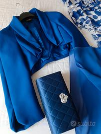 abito blu e bianco completo di accessori borsetta pochette blu foulard blu in pura seta giacchetto blu
