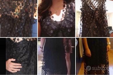 Bellissimo vestito , da cerimonia o x una occasione speciale, in tulle nero fil coupe ‘, grandi pois neri tridimensionali decorativi su tutto l’abito, smanicato, scollo V e piccola rouches sul davanti. Dotato di sottoveste nera in acetato e viscosa, con spalline regolabili e scollo a V. L’abito sopra è trasparente, più lungo rispetto alla sottoveste in modo da creare una discreta ed elegante trasparenza sotto al ginocchio. L’abito in tulle può essere indossato da entrambi i lati, con lo scollo a V davanti o sulla schiena. Per questo motivo l’etichetta è presente solo sulla sottoveste. Taglia 44/M, misure nel dettaglio in foto. Indossato solo 1 volta, per mezza giornata, nell’occasione in foto da cui si può capire anche l’indosso . Dotato di custodia in plastica con logo Ottod’Ame. Prezzo di acquisto 310 euro .