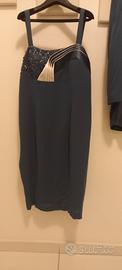 vestito da cerimonia color lavagna "PREDENZE" composto da vestito con spalline e sul petto c'è un motivo a onda lavagna e bianco con tanti piccoli strass + coprispalle