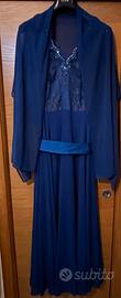 Vestito da cerimonia di colore blu acquistato in un atelier , con corpetto ricamato con aggiunta di strass. Completo di scialle e cintura sulla vita.