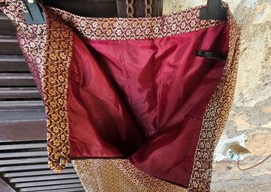Bellissimo completo etnico composto da top, gonna e stola. I capi sono in tessuto lucido e presentano una cangiante combinazione di viola e oro. - Top senza maniche con scollo rotondo. - Gonna lunga con motivo geometrico. Gonna e top foderati internamente.Stola lunga e ampia, ideale per completare l'outfit. - Perfetto per occasioni speciali.