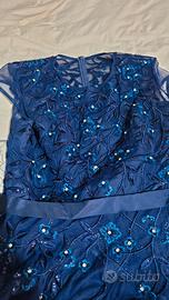 vestito da cerimonia, indossato una sola volta, blu, con brillantini e fantasie a fiori, particolari vedo non vedo sul dietro della schina.